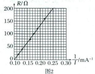 由$R = 0$时,$\frac{1}{I}=0.100mA^{-1}$,代入可得欧姆表总内阻为$r=\frac{E}{I}=133\Omega$