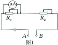 (2)已知图1中电源的电动势为1.5 V,微安表的内阻约为1 200 $\Omega$、量程250 $\mu$A,若在$AB$间接电流传感器,调节$R_x$、$R_2$使得微安表满偏,此时电流传感器读数为10.00 mA,则图中滑动变阻器$R_x$的规格应选