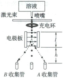 [例8](2025·河南卷)流式细胞仪可对不同类型的细胞进行分类收集,其原理如图所示。仅含有一个$A$细胞或$B$细胞的小液滴从喷嘴喷出(另有一些液滴不含细胞),液滴质量均为$m = 2.0×10^{-10}kg$。当液滴穿过激光束、充电环时被分类充电,使含$A$、$B$细胞的液滴分别带上正、负电荷,电荷量均为$q = 1.0×10^{-13}C$。随后,液滴以$v = 2.0m/s$的速度竖直进入长度为$l = 2.0×10^{-2}m$的电极板间,板间电场均匀、方向水平向右,电场强度大小为$E = 2.0×10^5N/C$。含细胞的液滴最终被分别收集在极板下方$h = 0.1m$处的$A$、$B$收集管中。不计重力、空气阻力以及带电液滴间的作用。求: