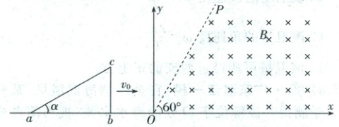 7.(2025·河南模拟预测)如图所示,平面直角坐标系$xOy$内有一射线$OP$,与$x$轴正方向的夹角为$60^{\circ}$,在射线$OP$和$x$轴之间的区域存在匀强磁场,磁感应强度大小为$B$,方向垂直坐标平面向里。坐标平面内有一刚性直角三角形金属线框$abc$,$\angle\alpha=30^{\circ}$,总电阻为$R$,线框在外力的作用下以恒定速度$v_{0}$沿$x$轴正方向运动,运动过程中线框不翻转,且$ab$边始终与$x$轴重合。从线框进入磁场区域开始计时,在时刻$t_{0}$线框内的电流达到最大值,则下列说法正确的是 (