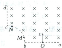 [例2] 如图所示,磁感应强度为 $ B $ 的匀强磁场方向垂直纸面向里,图中虚线为磁场的边界,其中 $ bc $ 段是半径为 $ R $ 的四分之一圆弧,$ ab $、$ dc $ 的延长线通过圆弧的圆心,$ Ob $ 长为 $ R $。一束质量均为 $ m $、电荷量均为 $ q $ 的粒子,在纸面内以不同的速率从 $ O $ 点垂直 $ ab $ 射入磁场,已知所有粒子均从圆弧边界射出,其中 $ M $、$ N $ 是圆弧边界上的两点,不计粒子重力和粒子间的相互作用。则下列分析中正确的是 (