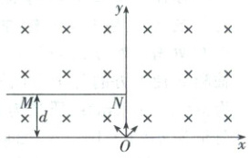 [例1] (2025·安徽卷)如图,在竖直平面内的 $ Oxy $ 直角坐标系中,$ x $ 轴上方存在垂直纸面向里的匀强磁场,磁感应强度大小为 $ B $。在第二象限内,垂直纸面且平行于 $ x $ 轴放置足够长的探测薄板 $ MN $,$ MN $ 到 $ x $ 轴的距离为 $ d $,上、下表面均能接收粒子。位于原点 $ O $ 的粒子源,沿 $ Oxy $ 平面向 $ x $ 轴上方各个方向均匀发射相同的带正电粒子。已知粒子所带电荷量为 $ q $、质量为 $ m $、速度大小均为 $ \dfrac{qBd}{m} $。不计粒子的重力、空气阻力及粒子间的相互作用,则 (