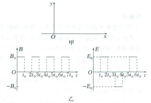 (2025·江苏南通一模)如图甲所示,$ xOy $ 平面内存在着变化电场和变化磁场,变化规律如图乙所示,磁感应强度的正方向为垂直纸面向里、电场强度的正方向为 $ +y $ 方向。$ t = 0 $ 时刻,一电荷量为 $ +q $、质量为 $ m $ 的粒子从坐标原点 $ O $ 以初速 $ v_0 $ 沿 $ x $ 轴正方向入射(不计粒子重力)。$ B - t $ 图像中 $ B_0 = \frac{2\pi m}{qt_0} $,$ E - t $ 图像中 $ E_0 = \frac{mv_0}{qt_0} $。求:
