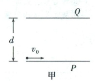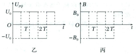 如图甲所示,水平放置的平行金属板 $ P $ 和 $ Q $ 相距为 $ d $,两板间存在周期性变化的电场或磁场。$ P $、$ Q $ 间的电势差 $ U_{PQ} $ 随时间的变化规律如图乙所示,磁感应强度 $ B $ 随时间变化的规律如图丙所示,磁场方向垂直纸面向里为正方向。$ t = 0 $ 时刻,一质量为 $ m $、电荷量为 $ +q $ 的粒子(不计重力),以初速度 $ v_0 $ 由 $ P $ 板左端靠近板面的位置,沿平行于板面的方向射入两板之间,$ q $、$ m $、$ d $、$ v_0 $、$ U_0 $ 为已知量。