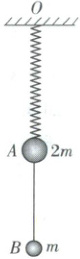 [例 4] (多选)(2025·甘肃·高考真题)如图,轻质弹簧上端固定,下端悬挂质量为 $2m$ 的小球 $A$,质量为 $m$ 的小球 $B$ 与 $A$ 用细线相连,整个系统处于静止状态。弹簧劲度系数为 $k$,重力加速度为 $g$。现剪断细线,下列说法正确的是 (