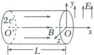 如图,有一内半径为 $2r$、长为 $L$ 的圆筒,左右端面圆心 $O'$、$O$ 处各开有一小孔。以 $O$ 为坐标原点,取 $O'O$ 方向为 $x$ 轴正方向建立 $xyz$ 坐标系。在筒内 $x \leq 0$ 区域有一匀强磁场,磁感应强度大小为 $B$,方向沿 $x$ 轴正方向;筒外 $x \geq 0$ 区域有一匀强电场,电场强度大小为 $E$,方向沿 $y$ 轴正方向。一电子枪在 $O'$ 处向圆筒内多个方向发射电子,电子初速度方向均在 $xOy$ 平面内,且在 $x$ 轴正方向的分速度大小均为 $v_0$。已知电子的质量为 $m$、电荷量为 $e$,设电子始终未与筒壁碰撞,不计电子之间的相互作用及电子的重力。