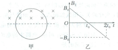 (多选)(2025·安徽合肥联考) 如图甲所示,一圆形金属线圈上半部分处于匀强磁场中,线圈匝数为 $ n $,线圈固定不动。$ t = 0 $ 时匀强磁场的磁感应强度的方向垂直纸面向里,磁感应强度 $ B $ 随时间 $ t $ 变化的关系图像如图乙所示,已知线圈的半径为 $ r $,线圈总电阻为 $ R $,则(