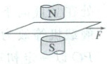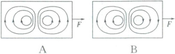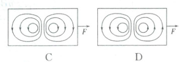 (2025·河南卷) 如图,一金属薄片在力 $ F $ 作用下自左向右从两磁极之间通过。当金属薄片中心运动到 $ N $ 极的正下方时,沿 $ N $ 极到 $ S $ 极的方向看,下列图中能够正确描述金属薄片内涡电流绕行方向的是(