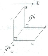 (多选)(2025·黑吉辽蒙卷) 如图,“ ”形导线框置于磁感应强度大小为 $ B $、水平向右的匀强磁场中。线框相邻两边均互相垂直,各边长均为 $ l $。线框绕 $ b $、$ e $ 所在直线以角速度 $ \omega $ 顺时针匀速转动,$ be $ 与磁场方向垂直。$ t = 0 $ 时,$ abef $ 与水平面平行,则(