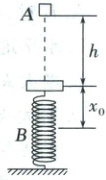 10.(2025·重庆模拟预测)质量为$m$的钢板与直立轻弹簧的上端连接,弹簧下端固定在地上,钢板处于平衡状态。一质量也为$m$的物块从钢板正上方高为$h$的$A$处由静止释放,落在钢板上并与钢板一起向下运动$x_0$后到达最低点$B$,已知重力加速度为$g$,空气阻力不计。则(