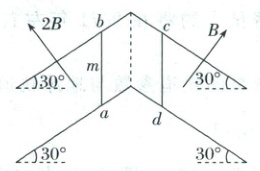 解析:两导体棒沿轨道向下滑动,根据右手定则可知回路中的电流方向为$abcda$,故A错误;对于任意时刻当电路中的电流为$I$时,对$ab$根据牛顿第二定律得$mg\sin 30° - 2BIL = ma_{ab}$,对$cd$根据牛顿第二定律得$m'g\sin 30° - BIL = m'a_{cd}$,又$a_{ab}=a_{cd}$,解得$m'=\frac{m}{2}$,故B错误;分析可知两个导体棒产生的电动势相互叠加,随着导体棒速度的增大,回路中的电流增大,导体棒受到的安培力在增大,故可知当安培力沿导轨方向的分力与重力沿导轨向下的分力平衡时导体棒将匀速运动,此时电路中的电流达到稳定值,此时对$ab$分析可得$mg\sin 30° = 2BIL$,解得$I=\frac{mg\sin 30°}{2BL}$,故C错误;开始运动后,因两导体棒的加速度大小相等,因此两导体棒的速度相等,根据法拉第电磁感应定律有$E = BLv + 2BLv = 3BLv$,感应电流$I=\frac{E}{2R}=\frac{3BLv}{2R}=\frac{mg\sin 30°}{2BL}$,解得$cd$棒最终下滑速度为$v=\frac{mgR}{6B^2L^2}$,故D正确。