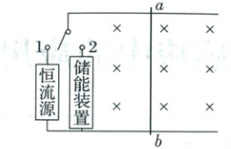 (2025·湖北武汉模拟预测)福建舰搭载了我国自主研发的电磁弹射和阻拦技术用于舰载机的起飞和降落。某兴趣小组开展电磁弹射阻拦系统研究,设计了如图所示的简化模型,两根固定于水平面内的光滑平行金属导轨间距为$l$,电阻不计,导轨区域存在竖直向下的匀强磁场,磁感应强度大小为$B$。一质量为$m$、电阻为$R$的金属棒$ab$,垂直放在导轨间。当质量为$M$的飞机(模型)要弹射起飞时,将它与金属棒锁定,选择开关$S$与$1$闭合,恒流源输出恒定电流,大小为$I$,经过时间$t_1$,飞机达到起飞速度$v_1$,解除锁定,飞机起飞离舰;飞机降落时,将选择开关$S$与$2$闭合,飞机通过阻拦索钩拉金属棒,以共同速度$v_2$一起开始减速着舰,金属棒与储能装置(非纯电阻)串联,减速同时还能实现动能的回收,经过$t_2$时间飞机速度减为$0$,$v_1$等于$v_2$,但均是未知量。下列关于起飞和阻拦过程说法正确的是(