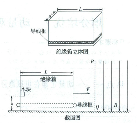 (2025·云南卷)如图所示,光滑水平面上有一个长为$L$、宽为$d$的长方体空绝缘箱,其四周紧固一电阻为$R$的水平矩形导线框,箱子与导线框的总质量为$M$。与箱子右侧壁平行的磁场边界平面如截面图中虚线$PQ$所示,边界右侧存在范围足够大的匀强磁场,其磁感应强度大小为$B$、方向竖直向下。$t = 0$时刻,箱子在水平向右的恒力$F$(大小未知)作用下由静止开始做匀加速直线运动,这时箱子左侧壁上距离箱底$h$处、质量为$m$的木块(视为质点)恰好能与箱子保持相对静止。箱子右侧壁进入磁场瞬间,木块与箱子分离;箱子完全进入磁场前某时刻,木块落到箱子底部,且箱子与木块均不反弹(木块下落过程中与箱子侧壁无碰撞);木块落到箱子底部时即撤去$F$。运动过程中,箱子右侧壁始终与磁场边界平行,忽略箱壁厚度、箱子形变、导线粗细及空气阻力。木块与箱子内壁间的动摩擦因数为$\mu$,假设最大静摩擦力等于滑动摩擦力,重力加速度为$g$。