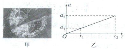 3.(2025·山东枣庄三模)如图甲是国产科幻大片《流浪地球2》中人类在地球同步静止轨道上建造的空间站,人类通过地面和空间站之间的“太空电梯”往返于天地之间。图乙是人乘坐“太空电梯”时由于随地球自转而需要的向心加速度$ a $与其到地心距离$ r $的关系图像,已知$ r_{1} $为地球半径,$ r_{2} $为地球同步卫星轨道半径,下列说法正确的是 (