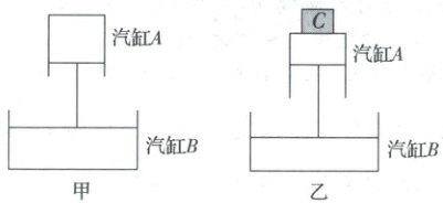 4.(2025·山东模拟预测)某同学设计的空气减震器模型如图甲所示,它主要由活塞和导热性能良好的汽缸构成,两轻质活塞通过横截面积不计的轻杆连接。将该模型置于水平地面上,轻杆与地面垂直,汽缸内密闭气体可视为理想气体。汽缸$ A $中活塞的横截面积$ S = 50\ cm^2 $,初始时活塞到汽缸$ A $顶端的距离$ L_{A} = 10\ cm $,汽缸$ A $内气体的压强$ p_{A} = 1.2×10^{5}\ Pa $。现将质量$ m = 20\ kg $的物块$ C $置于汽缸$ A $顶部,如图乙所示。一段时间后,系统重新达到平衡。已知汽缸$ B $中活塞的横截面积为汽缸$ A $中活塞横截面积的2倍,活塞与汽缸间的摩擦均忽略不计,汽缸始终密封良好,环境温度保持不变,大气压强$ p_{0} = 1.0×10^{5}\ Pa $,取$ g = 10\ m/s^2 $。下列说法正确的是 (