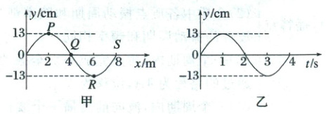 解析:由题图甲可得,波长为$\lambda=8 m$,由题图乙可得,周期为$T=4 s$,则波速为$v=\frac{\lambda}{T}=2 m/s$,故A错误;根据波沿$x$轴正方向传播,由题图甲可得,在$t=0$时,质点$S$在平衡位置且向下振动,因此题图乙与质点$S$的振动不符,故B错误;由于$t=6 s=\frac{3}{2}T$,因此质点$R$经过$6 s$后处于波峰位置,此时位移最大,故C正确;质点不随波的传播而移动,因此质点在$y$方向上振动,横坐标不变,故D错误。