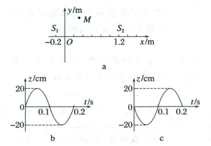 2. (多选)(2025·辽宁省协作校一模)如图a所示,在$xOy$平面内有$S_1$和$S_2$两个波源分别位于$x_1 = -0.2$m和$x_2 = 1.2$m处,振动方向与$xOy$平面垂直并向周围空间传播,图像分别如图b、c所示,$t = 0$时刻同时开始振动,波速为$v = 2$m/s。$M$为$xOy$平面内一点,$\Delta r = MS_2 - MS_1$,整个空间有均匀分布的介质。下列说法正确的是(