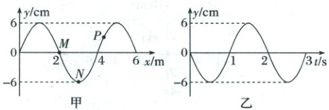 解析:由乙图知$t=2 s$时,质点$M$的振动方向沿$y$轴负方向,根据“同侧法”可知该简谐横波沿$x$轴负方向传播,故A错误;由乙图可知,质点$M$的振动周期为$2 s$,振幅为$6 cm$,振动方程$y=-A\sin\frac{2\pi}{T}t=-6\sin\pi t(cm)$,故B错误;由甲图可知,$t=2 s$时刻质点$N$的振动方向将沿$y$轴正方向,再经过$\frac{T}{4}$后,其运动到平衡位置,质点$N$在$t=2.5 s$时刻的位置为$y=0$,故C正确;在$2\sim3.5 s$时间内,若质点$P$从特殊位置(波峰、波谷或平衡位置)开始振动,则其路程为$s=\frac{1.5}{2}×4A=18 cm$,由甲图可知,$t=2 s$时质点$P$从一般位置开始振动,在$1.5 s$时间内的路程小于$18 cm$,故D错误。故选C。