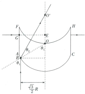 (2)若该单色光线从$G$点沿$GE$方向垂直$AF$射入介质,第一次射出介质的点为$D$,且$O'E = \frac{\sqrt{2}}{2}R$,可知$\sin \theta = \frac{\frac{\sqrt{2}}{2}R}{R} = \frac{\sqrt{2}}{2}$