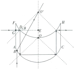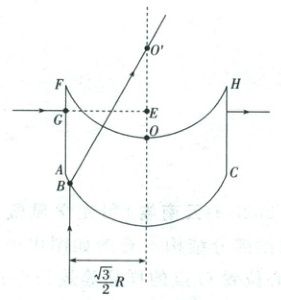 [例 4] (2025·山东卷)由透明介质制作的光学功能器件截面如图所示,器件下表面圆弧以 $ O $ 点为圆心,上表面圆弧以 $ O' $ 点为圆心,两圆弧的半径及 $ O $、$ O' $ 两点间距离均为 $ R $,点 $ A $、$ B $、$ C $ 在下表面圆弧上。左界面 $ AF $ 和右界面 $ CH $ 与 $ OO' $ 平行,到 $ OO' $ 的距离均为 $ \frac{9}{10}R $。