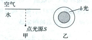 [例 8] (2025·江苏南京二模)为了装点夜景,常在喷水池水下安装彩灯。如图甲所示,水下有一点光源 $ S $,同时发出两种不同颜色的 $ a $ 光和 $ b $ 光,在水面上形成了一个有光射出的圆形区域,俯视如图乙所示,环状区域只有 $ b $ 光,中间小圆为复色光,下列说法正确的是(