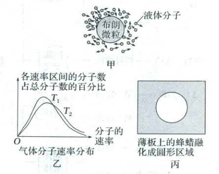 解析:图甲中微粒越小,单位时间内受到液体分子撞击次数越少,则微粒越趋于不平衡,则布朗运动越明显,故A正确;图乙中峰值大的曲线对应的分子速率小,则对应的气体温度较低,故B错误;图丙中,实验现象表明材料具有各向同性,则说明薄板材料可能是多晶体,也有可能是非晶体,故C、D错误。