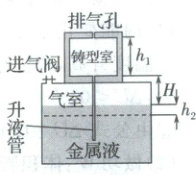 (1)金属液刚好充满铸型室时,有$h_1S_1 = h_2S_2$,代入数据解得$h_2 = 0.05m$,则气室内气体的压强$p_1 = p_0 + \rho g(h_1 + H + h_2)$,代入数据解得$p_1 = 1.2 × 10^5 Pa$。