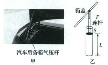 [例 7](2025·内蒙古赤峰·二模)图甲为后备箱气压杆的示意图,气压杆内部的高压气体被活塞密封在汽缸中。在后备箱打开或关闭过程中,气压杆内部的气体体积发生变化。箱盖打开静止在某位置时,活塞到汽缸底部的距离为$L$,活塞的横截面积为$S$。箱盖作用于连杆上的沿杆方向的力为$9p_{0}S$,如图乙所示。已知大气压强为$p_{0}$,重力加速度为$g$。不计活塞与容器壁的摩擦及连杆和活塞的质量,忽略气体温度的变化。