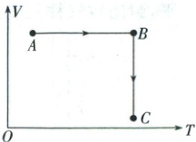 解析:$A→B$过程,体积不变,则$W = 0$,温度升高,则$\Delta U > 0$,根据热力学第一定律$\Delta U = W + Q$,可知$Q > 0$,即该过程吸热,故A正确;$B→C$过程,温度不变,则$\Delta U = 0$,体积减小,则$W > 0$,根据热力学第一定律$\Delta U = W + Q$,可知$Q < 0$,即该过程为放热过程,故B错误;$A→B$过程,体积不变,温度升高,根据$\frac{p}{T}=C$,可知压强变大,即状态$A$压强比状态$B$压强小,故C正确;状态$A$的温度低于状态$C$的温度,可知状态$A$的内能比状态$C$的小,故D正确。