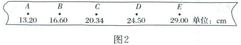 (2) 图 2 所示是纸带上连续打出的五个点 $ A $、$ B $、$ C $、$ D $、$ E $ 到起点的距离。则打出 $ B $ 点时重锤下落的速度大小为