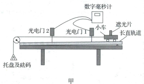 (1) 将两光电门安装在长直轨道上,选择宽度为 $ d $ 的遮光片固定在小车上,调整轨道倾角,用跨过定滑轮的细线将小车与托盘及砝码相连。选用 $ d = $