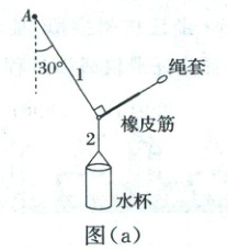 某兴趣小组设计了一个可以测量质量的装置。如图(a),细绳 1、2 和橡皮筋相连于一点,绳 1 上端固定在 $ A $ 点,绳 2 下端与水杯相连,橡皮筋的另一端与绳套相连。