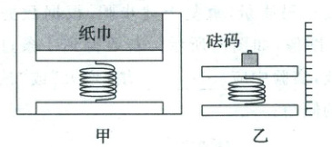 有一款称为“一抽到底”的纸巾盒改进装置,如图甲所示,该装置由两块挡板和弹簧组成,弹簧连接两块挡板。该装置放在纸巾盒底部,可将整包纸巾顶起,以保持最上面的纸巾能够在纸巾盒取用口。科技实践小组的同学为了研究该装置中弹簧的特征,设计如图乙所示。测量出数据记录见下表格: