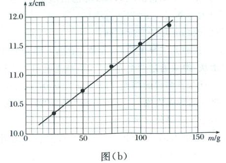 (1) 将一芒果放入此空杯,按上述操作测得 $ x = 11.60 \, cm $,由图(b)可知,该芒果的质量 $ m_0 = $
