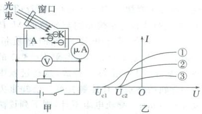 解析:由爱因斯坦光电效应方程得$eU_ \mathrm{c}=E_ \mathrm{k}=h\nu - W_0$,可以看出遏止电压与频率呈线性关系,频率越大,遏止电压越大,所以由题图乙可知,①光的频率等于③光的频率,③光的频率低于②光的频率,所以入射光光子的能量$\varepsilon_2>\varepsilon_1=\varepsilon_3$,光电子的最大初动能$E_ \mathrm{k_2}>E_ \mathrm{k_1}=E_ \mathrm{k_3}$,故A、B错误;由题图乙可知,①光对应的饱和光电流大于③光对应的饱和光电流,因为饱和光电流越大,单位时间内逸出的光电子数越多,且逸出的光电子数越多,入射的光子数也越多,所以单位时间照射到K上的光子数$n_1>n_3$,故C正确;同一阴极K的逸出功相等,故D错误。
