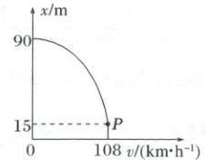 解析:对匀减速运动,满足$v^{2}-v_{0}^{2}=-2ax$,则$x - v$图像为抛物线,故A正确;汽车在反应时间内做匀速直线运动,由题图可知对应于直线段,反应时间内的位移为$x_1 = 15 \mathrm{m}$,速率为$v_0 = 108 \mathrm{km/h} = 30 \mathrm{m/s}$,则反应时间为$t_1=\frac{x_1}{v_0}=\frac{15}{30} \mathrm{s} = 0.5 \mathrm{s}$,故B错误;刹车过程的位移为$x_2 = (90 - 15) \mathrm{m} = 75 \mathrm{m}$,根据$-v_{0}^{2}=2ax_2$,解得$a = - 6 \mathrm{m/s^2}$,故C错误;刹车的时间为$t_2=\frac{-v_0}{a}=5 \mathrm{s}$,故D错误。