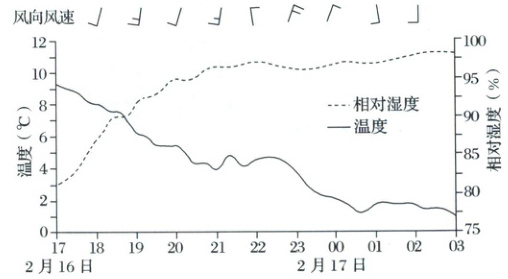 1. 造成2月16日17时-21时大气相对湿度变化的主要原因是(