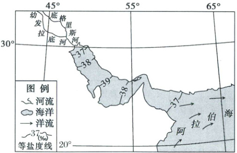 (2)B 第1题,本题主要考查海水盐度的影响因素。河口处有淡水注入,海水盐度低;波斯湾海域封闭,淡水河流注入少,气温高,蒸发量大,海水盐度高;阿拉伯海海水盐度相对波斯湾较低。据图可知,河口处出现37‰的盐度数值,阿拉伯海也出现37‰的盐度数值,而两者之间的海域盐度最大处是39‰,所以,从河口到阿拉伯海,表层海水盐度先升后降。故选C。第2题,本题主要考查洋流。阿拉伯海处于北印度洋,8月份盛行西南季风,洋流流向为自西南向东北,与风向一致,该洋流为北印度洋季风洋流,B正确;该处纬度较低,位于北半球,而西风漂流位于南半球中纬度海区,A错误;北印度洋季风洋流不属于中低纬海区大洋环流,C错误;该海域基本上都在30°N以南,且往北为陆地,不会出现中高纬海区大洋环流,D错误。
