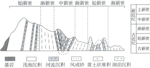 (2)题,图示地层基本以中新世为中心对称分布,且地层向下弯曲,图中左侧为向斜构造,右侧为背斜构造;图中左侧以中新世年龄最新且为对称轴向两侧越来越老,图中右侧始新世处形成背斜构造,最上部地层年龄最新,结合图例可知,始新世最新地层均为风成砂,而原来为海洋环境,说明始新世晚期气候趋于干旱,故B正确;图中中新世地层发生了弯曲变形现象,说明褶皱发生在中新世之后,故A错误;图中渐新世及之后的地层中已无浅海沉积,说明古海洋退出时间早于渐新世,故C错误;图示渐新世主要为黄土状堆积地貌,而黄土堆积是风力沉积的结果,说明该时期风力作用强烈,故D错误。第