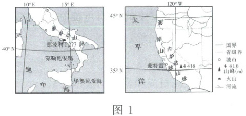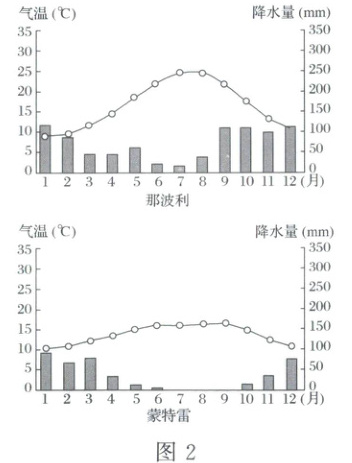 图1为意大利那波利和美国蒙特雷的地理位置。图2为意大利那波利和美国蒙特雷的气候资料。