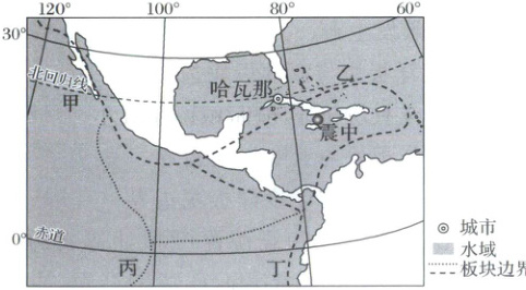 (1)题,本题主要考查板块构造学说及海洋灾害。读图可知,图中陆地地区为美洲中部地区,图中有两种板块边界,结合所学知识可知,丙边界为生长边界,乙边界为消亡边界,震中位于消亡边界附近,B正确。大西洋中脊是生长边界,A错误;震中的位置不属于太平洋板块,C错误;地震会引发海啸,但图中显示哈瓦那位于岛屿北部的沿海地区,由于岛屿阻挡,海啸对哈瓦那的影响相对较小,D错误。第