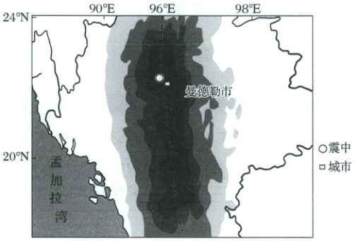 (2025·河南八市5月模拟)北京时间2025年3月28日,缅甸第二大城市曼德勒附近发生了7.9级地震,震源深度30km,此次地震的高烈度区呈现一条南北贯穿的带状区域。下图为该地此次地震烈度分布图(颜色越深,烈度越高)。据此完成1~2题。