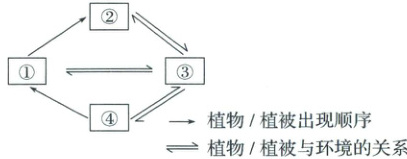 (2)题,据材料可知,该景观的形成多始于山坡上大石块后或微洼地内的第一棵树(先锋树),随后生长的植物(后生植物)种类和数量逐渐增多,整体形态呈现为条带状树篱。根据图中“植物/植被出现顺序”箭头指向可知,④为先锋树,①为后生植物,②为树篱。先锋树、后生植物和树篱均与微生境存在相互作用的关系,因此③为微生境。C正确,A、B、D错误。第