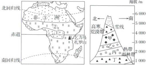 (2025·河北张家口一模)2024年9月4—6日,中非合作论坛峰会在北京召开,中非合作将更加广泛,中国人民对非洲的了解也将更加深入。如左图为非洲自然带分布图,右图为乞力马扎罗山垂直自然带分布示意图。据此完成1~3题。