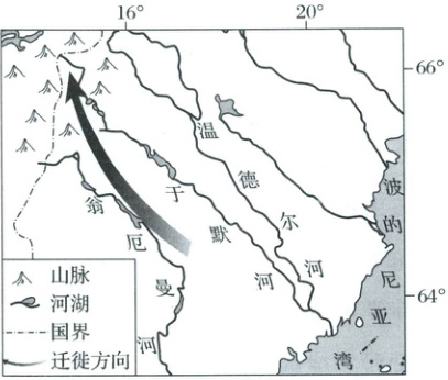 (2025·北京卷)每年4月中旬至5月初,瑞典的驼鹿开始从森林向草场迁徙。下图示意驼鹿迁徙的大致方向。读图,完成(1)~(2)题。