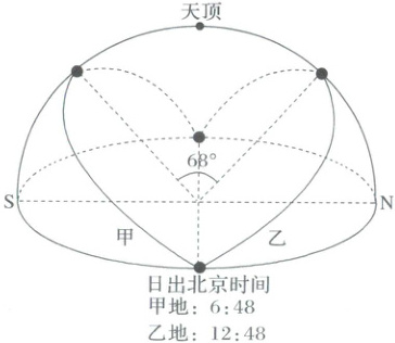 1.A 2.D 第1题,读图可知,甲乙两地此时日出方位都为正东,地方时为6:00,甲地的日出时间是北京时间6:48,可知甲地在120°E的西侧,差48分,经度差12°,故甲地经度为108°E,乙地的日出时间是北京时间12:48,可知乙地在120°E的西侧,差6小时48分,经度差102°,故乙地经度为18°E,故甲地位于乙地东侧,结合图中太阳视运动轨迹可知,甲地正午太阳位于正南,说明甲地位于北半球,乙地正午太阳位于正北,说明乙地位于南半球,故甲地位于乙地的东北,故选A。第2题,由材料可知,甲、乙两地太阳视运动轨迹呈对称分布,夹角为68°,此时太阳正东升,说明为春分日或秋分日,可知两地在春秋分的正午太阳高度均为90°-(68°÷2)=56°,故春、秋分时两地正午太阳高度之差均为0°,排除①②;由上题已知,甲位于北半球,乙位于南半球,夏至日太阳直射北回归线,冬至日太阳直射南回归线,两地正午太阳高度之差均达最大,且差值相等,排除③,④正确。故选D。