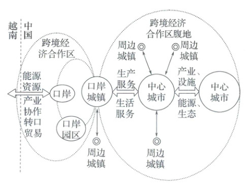 (2)题,合作区转型升级,加强了口岸城镇与腹地中心城市的产业、服务、设施等互动,会促使生产要素(人才、资金、技术等)流动加快,A正确;合作区发展跨境经济,腹地中心城市参与其中,外贸依存度应提升,B错误;转型升级推动产业优化,如发展服务业、循环经济等,会降低单位产值能耗,C错误;合作区促进产业分工协作,腹地中心城市会发展特色产业,同质化竞争应减弱,D错误。 故选A。