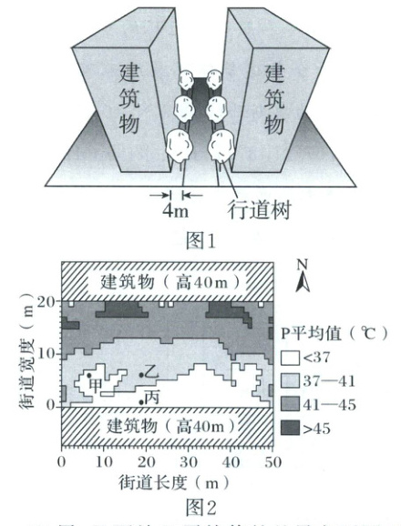 (1)题,图示甲处附近的P(生理等效温度)平均值较乙处小,结合该日“天气晴朗、风力微弱”,可判断甲处实际接受的太阳辐射小于乙处。读图可知,甲、乙两处距离路南侧建筑物均为6m左右,根据正午太阳高度公式计算,夏至日该地(48°N)正午太阳高度大约是65.5°,南侧建筑物(高40m)正午影长约18.26m,因此,正午前后甲、乙两处均位于南侧建筑物阴影中,不是建筑物遮阴造成两地P平均值存在差异,A错误。图中行道树距建筑物4m,结合太阳视运动轨迹可知,9~12时太阳位于甲、乙的东南方,上午时段东侧行道树遮阴作用明显,12~15时太阳位于甲、乙的西南方,下午时段西侧行道树遮阴作用明显;该地纬度较高,上午气温一般较低,达不到图示温度,结合一天中最高气温出现于14:00左右,可判断甲处因在气温最高时段内受到西侧行道树的遮阴作用较强,因此热感较弱,故D正确,B、C错误。第