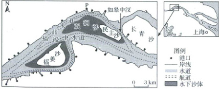 (1)题,涨潮时段,由于海水的顶托作用,河水流速减慢,河流水深会变大,特别是双涧沙附近水域,水位会变深,即符合小型船舶通行的水域在涨潮时期面积扩大,导致出现上行的通行高峰,B正确;此河段靠近入海口,地势低平,水位落差不大,A错误;泥沙含量对船舶通行数量影响不大,C错误;图中可以看出,河流两岸港口分布众多,河面宽度变化不大,D错误。第