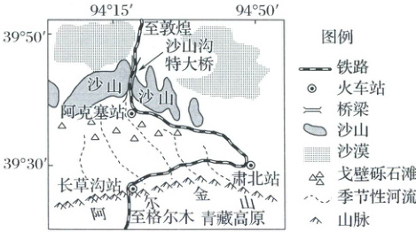 (2025·河北模拟)敦煌铁路是连接甘肃敦煌至青海格尔木的Ⅰ级电气化单线铁路,线路全长671千米,敦煌铁路沙山沟特大桥全长10.6千米,穿越地形蜿蜒曲折的沙山沟,两侧为高大的沙山。下图示意敦煌铁路经过的局部区域。据此完成1~2题。